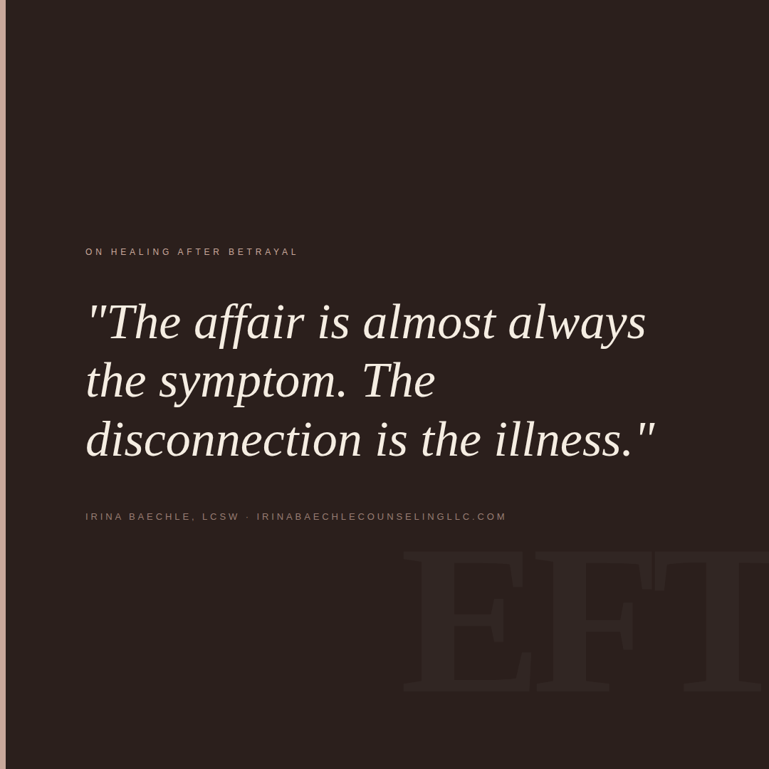 And the most painful part wasn't that it happened after years of distance and disconnection, as it typically does. It happened while the female partner was sick. She was recovering from surgeries, and she was physically and emotionally unavailable in their marriage, trying to heal her body. So, her partner went elsewhere to meet his needs.