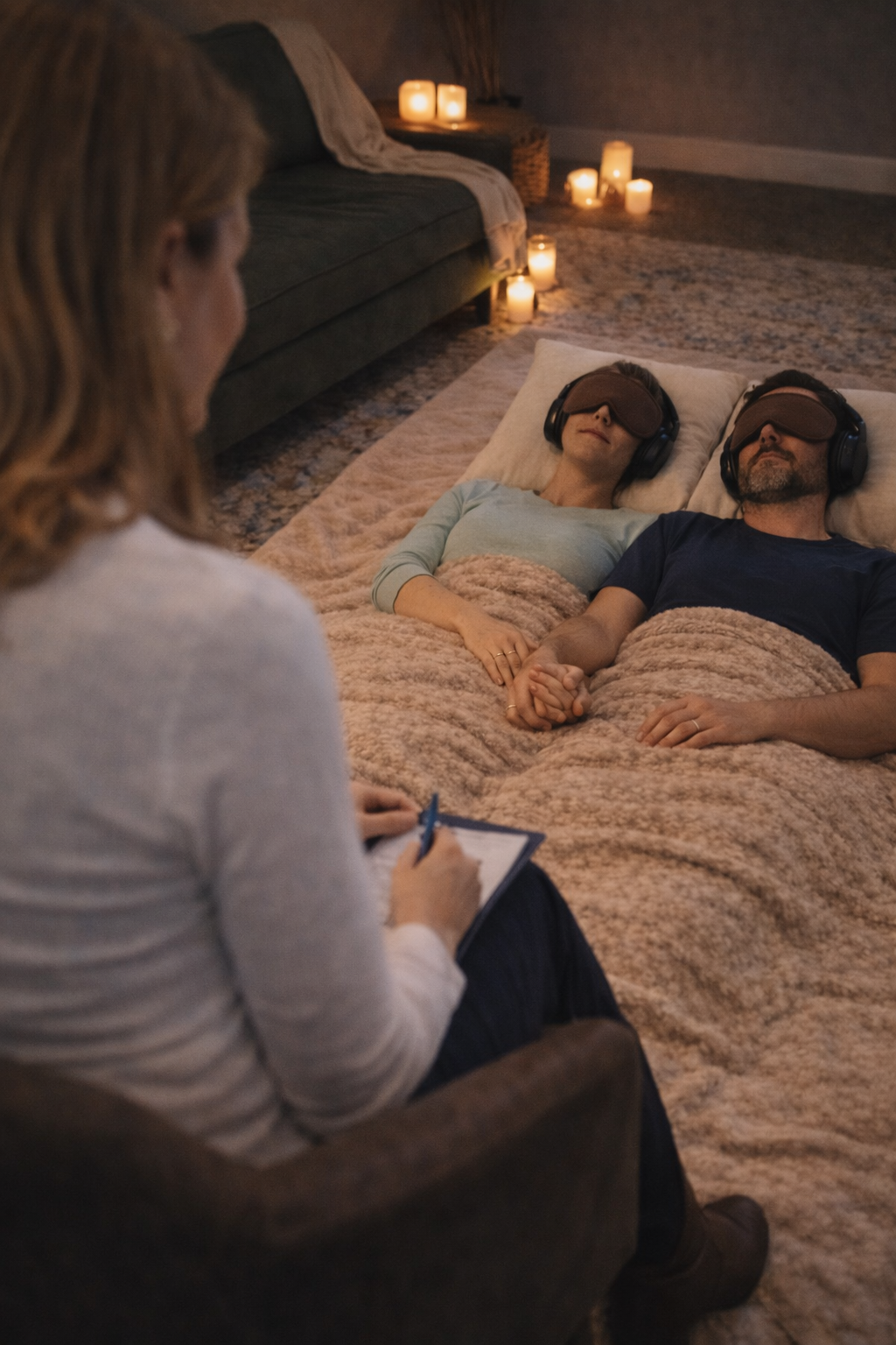 You’ll wear an eye mask and headphones, journeying inward while I support from the outside.